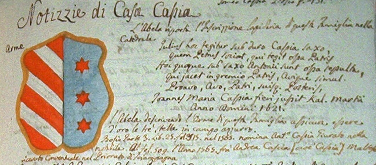 “Gaddo Cassia e’ l’Ascendente piu’ antico, ch’habbiamo in questa casa, visse introrno al 1450 mentre nel 1481 era uno de’ Giudici della nostra Citta; fu’ di lui figluolo Luca, che nel 1485 prende’ per moglie Agnese di Lenzo Barbara; Di Luca nacque un altro Gaddo, che visse nel 1536, e di questo si tiene, che fuse figliuolo Gilio, o’ sia Giulio Cassia, a’ cui si da’ titolo di nobile nel 1535 egli si fece padre di Pietro, dal quale nacque Antonio, che genero’ Gio Maria, padre del Barone Giacinto; quindi e’, che in una pietra sopra il sepolcro, ch’ha questa famiglia nella Chiesa Cattedrale si legge l’iscrittione, che segue. Iulius hoc tegitur sub duro Cassia faxo: Quem Perus fociat, qui tegit osa Patris: Hoc quoq, sub saxo Antonii sunt ossa sepulta: Qui iacet in gremio Patris, Auique simul: Proavo Avo, Patri suisq, posteris: Ionnes Maria Cassia fieri iusssit Kal. Martii: Anno Domini 1621 Giacinto poscia procreo’ Antonio, e Pietro, ch’hano per mogli Perna, & Eugenia, figliuole del Dottor Paolo Anastasio. Gio Maria Cassia fu’ Giurato nel 1589, 1593 & 1594 nella Notabile, e Capitano nel 1590 & 1591 e poscia di nuovo eletto all’ istesso officio, negli anni 1613, e 1614. Come anche piu’ volte essercito’ la carica di Giurato il figluolo Giacinto nell’ una e l’altra Universita’; e l’Avo Antonio nella Notabile di Giurato antiano l’anno 1582, questi fu’ Procuratore de’ poteri nella medesima, & il primo nell’ amministrtione del Cumolo della Carita’, soggetto molto pio, e che con larga mano istitui’ la fondatione per la predica, che si fa’ ogni domenica nella Chiesa parocchiale del Rabbato, & altri legati per honor del culto divino. Il medesimo porto’ in casa il feudo di Gharyexem, e Tabia, comprato dagli Inguanez, come altresi Avo suo Giulio possede fin del 1535 il territorio in contrada Vyed Dueli, & il giardino Gineyna del Migiarro. Hebbero quesi dell’ istessa famiglia molti altri poderi, e giardinii ch’al presente godono, & in particolare quello delle due fontane, che fu’ cambiato con l’orto di S. Antonio tal Ghimeri, per occasione dell’acque, che si sono condotte alla Citta Valletta. Gode anche di presente questa famiglia l’onorato titolo di Barone di Cicciano, il quale essendo stato gia’ comprato dal Dottor Francesco Mego nostro Cittadino, intorno al 1560, ritroviamo, che facendo egli una procura per conto del medesimo feudo, negli’ atti di Bonaventura di Bonetijs nel 1569 si qualifica in tal guisa. Uti Dominus utilis iurisdictionis criminalis, & mixta cum mero, mixtoque imperio, & gladii potestate, cognitioneo; primarum, & secundum causarum Castri Cicciani, constituit Procuratores Commendatarium eusdem Commenda, & Receptorem Neapolis, quivi nominati, & altri ad ratificandum quemcumque’ affectum factum dictae iurisdictionis criminalis, & adeandem exercendum iuxta forman cautelarum, & privilegiorum, qua & qua dictus Dominus constituens habet, & c. Da lui trapasso detto titolo nel Capitano Gregorio Xerri, e da questo in una sua grave infermita, non havendo figliuoli, fu’ lasciato al Dottor Ascanio Surdo suo cugino, il quale finalmente nell’atto matrimoniale tra’ Madalena sua figliuola co’ l predetto Giacinto Cassia glielo diede con gl’altri effetti della dote. Il sudetto feudo fu’ prima venduto da D. Vincenzo Caraffa del Duca d’Ariano a’ Pietro Antonio Spinello Conte di Seminara, e poi dal Duca Carlo suo figliuolo a’ Pietro Pignone di Napoli, e da questo a’ Christoforo Grimaldo, che lo vende’ al Dottor Mego, con assenso regio dato in Napoli da quel Vicere’ a’ 12 d’Agosto 1560. Nacque dalla medesima casa quel famoso Tomeo Cassia Piloto reale delel galee di questa Sacra Religione, che salvo’ quelle, e tutte l’altre dell’armata Cattolica, che lo seguirono in quell’ infausta terza giornata delel Gerbe l’anno 1560. Di lui hebbe il nascimento Narduccio, o’ Leonardo Giurato della Valletta nel 1583 di cui si figliuolo Bartolomeo, Capitano del S. Officio dell’ Inquisittione. E piu’ volte fu’ Giurato nell’istess Citta’ Pietro Cassia, marito d’Imperia Bonello, fondatore della cappella dedicate alla miabiliss. Assontione della B. Vergine, nella Chiesa de’ Reverendi Padri Osservanti della Valletta…. ” (From Abela’s “Della Descrittione di Malta del Commendatore Abela” (1647))