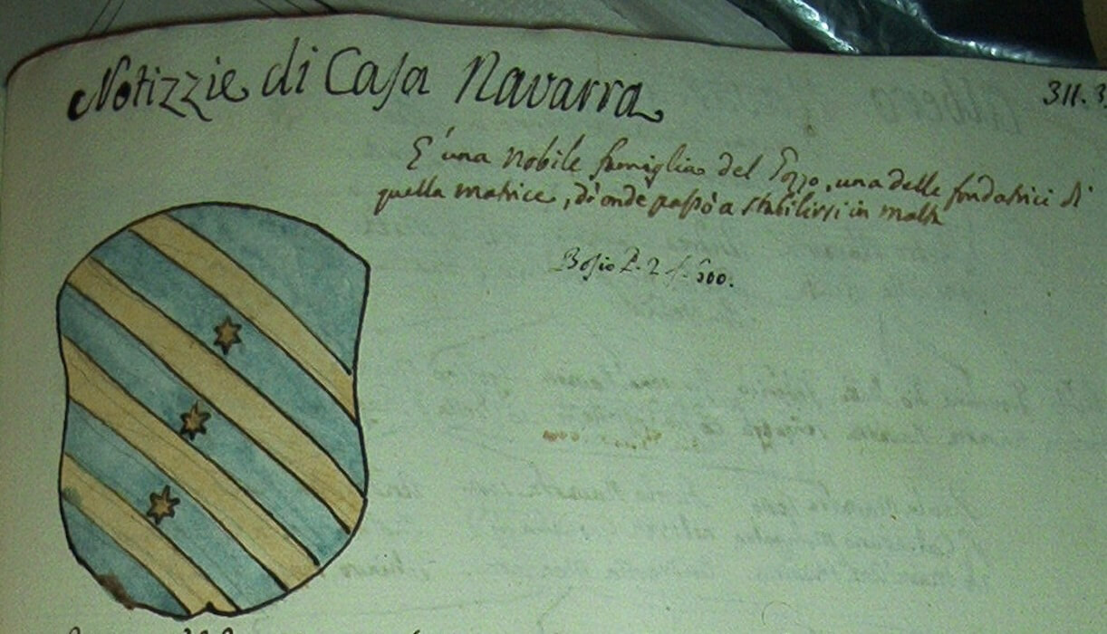 1.1.1.1. (First Marriage) Alvaro de Nava, last feudatory of Marsa and last castellano and Vice Admiral of Malta, (“a Pietro subentro’ Alvaro suo figliuolo, che ne fu’ investito a’ 14 di Marzo 1509 dal Vicere Don Raimondo di Cardona, e di nuovo dal Presidente Don Giovanni di Luna, per morte del Re’ Ferdinando a’ 16 di Marzo 1516. Alvaro, crediamo sia stato l’ultimo feudatario di questa Baronia, Castellano, e Viceammiraglio in Malta, fino all’ arrivo della Sacra Relig. Imperciocche o’ per compera, o’ per concessione del Re’, con restituire la regia Corte il danaro del prezzo, per il quale era stata venduta, o’ piu’ tosta impegnata, o’ in qualunque altra maniera, come si sia, ella venne in persona del Conte, poscia Duca di Monteleone, quasi nel 1530, allora appunto, quando si trattava (come dice il Bosio) della donatione di Malta a’ favour della Sacra Religione, dal cui Sig. Gran Maestro la Cassiera, Principe nostro Religiosissimo, fu’ finalmente comperata, per la di lui morte appresso riunita al Principato di quest’ Isole”), married (1) 1512 to Laurica Axac., Married (2) Imperia Bellia, with issue. (Moved to Sicily about 1530).
