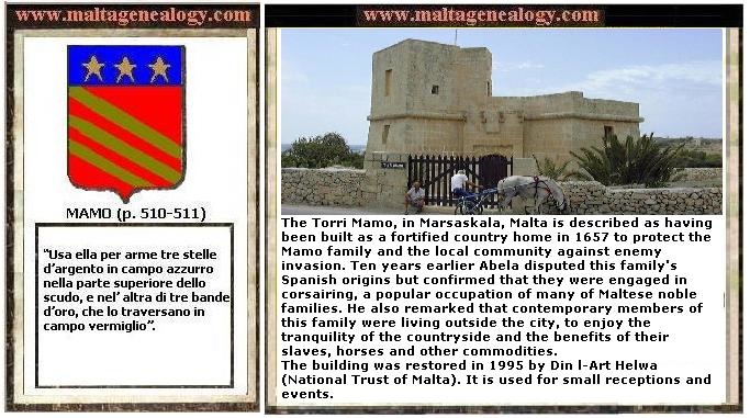 “E stato pensiero d’alcuni, che tal cognome fusse di qualche famiglia di quelle Catalane, che lascio’ in Malta Ruggiero di Loria, e forse d’una, ch’ e’ detta Maimo corrotta la voce in Mamo; fondandosi, che nella sua discendenza si ritrovi piu’ volte il nome di Guerao (Angaraldus) in Latino, assai proprio di quella Natione, e di molt’ altre famigle Maltesi, che di la’ hanno havuta origine. Il certo e’ ch’ ella sia delle antiche in quest’ Isola, e riconosca esserle, stato ne’ tempi andati un Gileyo, o’ Giuliano suo piu’ vecchio ascendente, molto ricco di stabili, d’armamenti, e d’un buon numero di schiavi, il che ci fa’ congetturare, ch’ egli essercitasse per aventura il corso, mentre ancora teneva nella propria casa luogo per custodirgli nomata tal Gholma, cioe de’ schiavi. Ma passiamo alle scritture, delle quali la piu’ antica, e di consideratione, che si sia capitata alle mani di questa casa, e’ il testamento di Simone figluol di Guerao, che visse intorno a’ gl’ anni 1390. Mori Simone l’anno 1514, nel quale fece detto testamento, ove ‘ chiamato Civis Notabilis Civitatis, & in cui lascia erede universale Imperia moglie di Bernardo Cassar, nata da Guerao suo figliuolo, ch’ allora era morto, e fa’ molti legati pij, & alcuni a’ favour d’una chiesa da lui fondata dentro il Casale Zebugi, ad honor dell’ Assunzione della B. Vergine, volendo, che la sua casa nella Citta’ fusse de’ fratelli, ch’ habitavano, fuori, perche servisse loro nell’ occorrenze di sospetti d’Armata, o’ di scorrerie de’ Mori. Uno dei sudetti fratelli, haveva nome Michele, di lui furono figliuoli un altro Guerao, Girolamo, Giovanni sacerdote professo in questa Sacra Religione d’obedienza Magisterale, e Dionisio padre di Michele, ch’ hebbe per moglie Francesca Xara’ vedova di Mariano Vella. Simone hebbe un altro figluolo che si chiamo Ncolo’ come apparisce in detto testamento, da costui nacque Francesco, che fu’ padre di Cola, o’ Nicolo’, questi genero’ un altro Francesco, che fu’ prima Bandoliere (officio militare nella Cavalleri di Malta), indi Giurato, e poscia Capitano della Verga, essendo nel Principato il Gran Maestro de Paula. Fu’ parimente fratello di Simone Giovanni, padre di Salv Mamo, ch’ attese a’ far il corso contro l’infedeli con una sua susta. Egli hebbe tre figluoli Giovanni Sacerdote profeso dell’ Ordine Domenicano, Gregorio eccellente medico fisico, e Gioseffo Notaio. Il Dottor Gregorio e’’ stato ammogliato con Lorenza Abela, da lei procreo’ il Canonico Don Mattia Dottor di Leggi, ch’ esercito’ di versi carichi di Giudicature, e la Giuratia di questa Citta’ Valletta e Gio Maria; questi fu’ marito di Leonora figluola di Matteo Vassallo segreto di Malta, e da esso matrimonio nacquero il Commendatore Fra’ Gerolamo Mamo sacerdote, Gio Giorgio medico fisico, Don Michele Tesoriere d questa Cattedrale, e Gregorio Dottor di leggi marito di Paola, figluola del Dottor Ascania Surdo. Gioseffo di cui fu’ moglie Leonora Cannella, divenne padre del Commendatore Fr. Domenico Mamo, del Canonico Don Mario, e di Pietro, dal cui matrimonio, con Franceschita figluola d’Ambrogio Falsone si gnerarono Giosefo, Ludovico, & altri figliuoli. Il predetto Giovanni fratello di Simone, oltre a Salvo, hebbe un altro figluolo nomato Marco, che fu’ padre del sacerdote D. Giovanni Mamo Paroco della Chiesa di S. Caterina del Zeytune, e di Andrea; questi genero’ Simone, da cui, e da Girolama Cumbo sua moglie nacque il Padre Salvatore Mamo Giesuita, facondo, e dotto predicatore, non meno nella Maltese, che Italiana favella. Per una scrittura del 1541 apparisce, che questa casa havesse il Iuspadronato della Chiesa, e del beneficio di S. Giovanni nella contrada dei Casal Tartarni, leggendosi, che Agostino, e Randino figluoli, & eredi di Salvo Mamo nominassero il beneficiato Oltre a’ Michele, e Giovanni fratelli di Simone si cava dal suo testamento, che n’havesse degl’ altri, benche non vi nominano (da’ qual avventura discendono gl’ altri rami dell’ istesso cognome) e che tutti habitasero fuori della Citta’: cosi’ facevano molti de’ nostri Isolani di buone, e facoltose case, elggendo ansi I vivere nelle Ville, per godere del piacevole riposo, ben proveduti di schiavi, cavalli, e di altri comodi (benche privi di quei degl’ officij pubblici) che tra’ I Cittadini nelle loro parzialita’, e rabbiose discordie, che pur troppo in queri tempi travagliarono la Citta.” (From Abela’s “Della Descrittione di Malta del Commendatore Abela” (1647)).