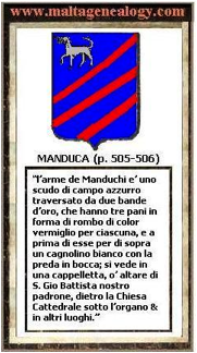 “Fu’ sempremai in Malta riguardevole questa famiglia, antica, e comoda in diversi poderi, e fra’ gl’ altri territorij (e’ quali alcuni ritengono il proprio cognomen della casa) d’uno ch’ e’ de’ migliori dell’Isola, presentemente da lei goduto nominato ta’ Wnezia. In quanto a’ I suoi Anenati habbiamo ben sicura traditione, che di due fratelli fatti schiavi in un lor giardino ta’ Wied Ballut da’ corsair, essendo l’uno morte nella prigione, (ottenuta l’altro la liberta’) rimanesse padrone di tutto il patrimonio della casa; Questo fu’ padre di Paolo, & avo d’ Angelo, di cui fu’ figluolo Antonio, cognominato il Cavaliere, per haver conseguito l’honor di quel grado dall’Imperadore Carlo V in Messina, allora quando dalla nostra Citta gli fu’ destinato Ambasciatore nel 1535. Mori’ Antonio nell’ anno 1558 lasciando I seguenti suoi figliuoli cioe Angelo, Vincenzo, e Don Giuseppe Canonico nella nostra Cattedrale, Dottor di leggi, e Vicario Generale. D’Angelo poscia nacque Gio Paolo, di cui furono figliuoli il Dottor Angelo Manduca, e Girolamo; il primo prese moglie D. Enziona di Giurato delal Citta’ di Terranova, cugina del Cavaliere F. Don Blasco di Giurato, a da lei procreo’ Angelo Girolamo Manduca, unico figliuolo, ch’hoggi vive c’ l padre. L’altro si fece religioso in Roma della Comp. di Gisu. Fu’ egli padre di molte lettere, erudito scrittore sopra alcuni libri della Sacra Scrittura. Di tutti ritroviamo in Malta l’ascendente piu’ antico Antonio Manduca Giudice delle cause civili della nostra Citta’ l’anno 1405. Antonio secondo fu’ Giurato nel 1517, 1522 & 1527 e Capitano nel 1537, il medesimo in una provisione del Mastro Secreto del Regno vien appellato in tal guisa Per lo magnifico Antonio de Manduca regio & imperiali Cavaliere Giur &Ambasc della Citati, et Isula di Malta ni su’ stati presentati certi Viceregii exequutorii, & c. Finalmente uno di questa casa essendo andato in Francia, fu’ deputato al governo di quel Signore, che fu’ poi Duca Marescial de Biron, come si legge nell’ Istoria della sua vita stampata in Lione l’anno 1614 et c’est une chose mervelleuse qu’ on observee en luy (si discorre del Marescialle) que ayant este’ nourry aux histories dans Brisambourg sous un nomme’ Manduca, docte personage, et Maltois de nation, etc di cui senza dir altro, bastando l’argomento, che al certo non sarebbe stato impiegato (massimamente forastiere) ad amministrare quel Principe, se non fusse stato conosciuto huomo d’ ingegno, e di singular talento, soggiugneremo solo, che l’arme de Manduchi e’ un scudo di campo……..” (From Abela’s “Della Descrittione di Malta del Commendatore Abela” (1647))