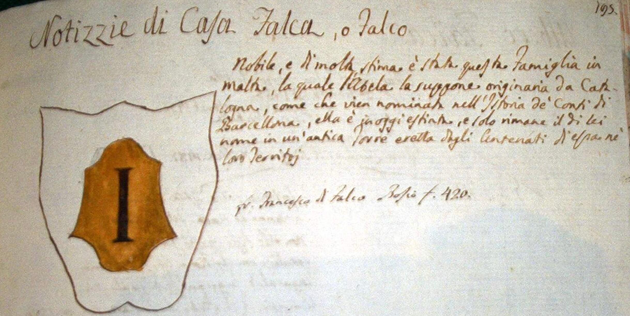 “Antichissima, e nobile, e’ stata questa famiglia in Malta, havendole conceduto il Re’ Federico Terzo in persona di Giovanni de Pellegrino sua vita durante, il tenimento di terre situato in quest’ isola in contrada di lu Zaccuni, sotto ricognitione della quarta parte dell’ entrata di essa terre, da darsi ogn’ anno alla regia Corte; Mori’ Gio intorno al 1340, o’ 50. Giacomo di Pellegrino suo figliuolo, ottenne dall’ istesso Re’ Federico il giardino grande nomato del Re’, allora tutto cinto di muro con due fontane, cioe Aayn Kayed, & Aayn Teuzien, & alcune terre contigue lavorecce, dette la Hafe, con un altro fonte, & un tenimento di terre appellato di Benuarrat per lui, e suoi eredi dal suo corpo discendenti in perpetuo, sotto servigio d’un cavallo armato, come si legge nel privilegio, in cui vien chiamato milite registrato nel libro degl’ anni 1360, & 1366 in uno de’ quali gli scrive il Re’ come a’ Capitano e Castellano di Malta. L’istesso Giacomo fu’ poscia proveduto in vita, del carico di Capitano di Malta, e Gozo, nominandosi anche nella patente co’ l titolo di Milite, la cui data essendo in Malta a’ 7 d’Aprile 1365 ci potrebbe suggerire che dovette esservi capitato allora di passaggio il Re’ Federico III. Fu’ sua moglie D. Margherita d’Aragona, da cui non hebbe figli maschi, ma solo tre femmine, come si cava dal testamento, ch’ ella fece nel 1418 co’ l quale si mori’: ad una di queste, ch’ haveva nome D. Leonora, non isdegno di prender per moglie Matteo del Carretto de’ Marchesi di Savona, ch’ habitava in Giorgenti, padre di Gio & avo di Federico Barone di Rahalmuto hoggi Contea, la cui sorella nomata parimente D. Margherita del Carretto, fu’ moglie di Pergiovanni di Mazara nostro cittadino nel mille quattro cento trenta quattro. Il sopradett Matteo fu’ il primo a’ nostro giuditio, che co’ l fratello, della casa Carretto, venisse a’ stanziare in Sicilia, e che quivi vivessi nel 1392, si ravvisa per una lettera, che gli scrisse da Catania il Re’ Martino a’ 5 di Febraio di dett’ anno, che comincia in tal guisa, Mattheo de Carretto, Marchioni Savona Consiliario familiars & fideli. Peroantoni Puglisi, Compagnuni, chi era di lu quonda Iaymu d’Alagona, & noviter fidili di la nostra Magistati exponi, chi uni haviti, e tiniti li tri soi cavalli, & uno mulu cum certi armi, et altri cosi soi, levati a’ dui soi scuderi, li quali sicurati passavanu di la vostro locu di Rachalmutu andandu a’ Giorgenti, etc. Girolamo Zurita ci fa’ ancora testimonianza, che un Marchese di Savona de I Carretti servisse al Re’ di Sicilia in questo tempo, tutto ch’ egli lo chiami Gerardo, e non Matteo, ecco le sue parole Sirvio’ tanbien al Rey de Sicilia en esta Guerra, que duro’ algunos anos Gerardo de Carretto Marques de Sahona, etc pero’ facendoci molta forza la detta letterra, il testamento di D. Margherita sua suocera, & altre scritture, che lo nominano Matteo, potremmo dire, che questo Gerardo fusse stato fratello di Matteo, non risultando contradittione, ch’ ambedue nell’ istesso tempo fussero trattati co’ l titolol di Marchese di Savona, come pur hoggi s’usa in molti luoghi di compartirsi il medesimo titolo in piu’ persone, o’ feudatarij dell’ istessa discendenza. Pero’ d’essere stato Gerardo fratello di Matteo n’habbiamo punto la prova, & e’ una scrittura di confermatione del Re’ Martino nel 1399 della vendita, che fa’ il nobile Gerardo Carretto Marchese di Savona al nobile Matteo Carretto suo fratello di tutta la ragione, ch’ haveva sopra Rahalmuto. Non siamo certi del tempo, che Matteo s’ammogliasse con D. Leonora figliuola di Giacomo Pellegrino, e di D. Margherita d’Aragona, la quale pero’ si cava bene dal suo testamento, che sopravivesse a Matteo, e che di lui rimanessero in vita, alla morte di lei 3 figliuoli cioe’ Giovanni, Antonello, e Federico del Carretto; del cui nobilissimo cognome ritiene fin hoggi il nome una contrada in quest’ isola, oltre molti ricchi poderi, che vi possedeva gia’ la medesima casa; il che si dimostra nel modo seguente. Perdona il Re Martino nel 1396 a Matteo del Carretto Barone di Rahalmuto quella passata ribellione, gli restituisce tutti I beni, e tra gl’ altri dice Matteo nelle sue domande (Item peti, chi lu dictu isser Matteu haia tutti li beni li quale ipsu, e so’ sociru havi a’ Malta. Placet, e per altresi, che tuttavia il nostro Giacomo allora vivesse. Ma rimettiamoci su’ l filo, e discorso dei Pellegrini. Paolo fu’ Giurato nel 1405, & intervene per uno de’ principali ad un Consiglio de’ nostri Cittadini nel 1420 & appresso nel 1428 per una regia provisione data in Valenza si fa’ fede, ch’ egli sia stato deputato Capitano della nostra Citta’, & Isola per lo spatio di due anni. Gio de Pellegrino Giurato nel 1445. L’istesso, o’ altro Paolo nel 1458 si legge ch’ alcun tempo prima sia stato reio Sereto in Malta. E Niccolo’ Pellegrino Giurato nel 1548. Nel Gozo parimente ritroviamo questa famiglia Pino Giurato nel 1406, Federico Giurato nel 1441, & un altro Pino Giurato nel 1469 & 1474 Intorno all’ origine de I Pellegrini in Malta, habbiamo fatto altre volte congettura, che sia da Catalogna, e da Villafranca de Panades (ove si legge sia stata di questo cognome nobiel schiatta per quanto D. Margherita moglie di Giacomo, fra’ gl’ altri beni, lascia alone rendite ne I detti luoghi di Panades, e Villafranca, come si dice nel suo testamento, a’ suoi figliuoli, e nipoti rimasteli per aventura tra’ le faculta’ del marino; ma essendoci poscia capitate notitie, che in Messina fin del 1264 vi fusse un Giacomo Pellegrino prima della venuta in Sicilia del Re’ Pietro, e doppo nel 1285, & 1373 farsi quivi mentione di Gio Pellegrino de Messana; vedodo altresi’, che il Capibrevio ne’ feudi di Malta ci attesti, che il padre di Giacomo nostrosi chiamasse Cio, entrassimo in pensiero che forse questo potesse essere quel