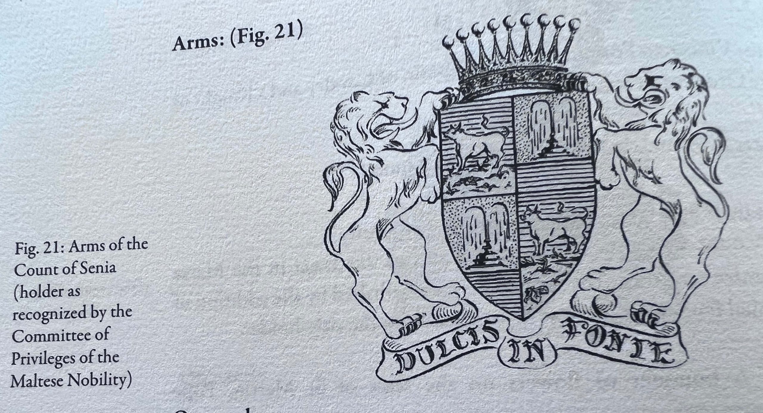 A patent was granted by Grand Master Rohan on the 6th June 1795, to Vincenzo Fontani, who was thereby ennobled with the title of Conte of the lands denominated “della Senia” and situated in the Marsa District. The title is to descend to the issue male and female of the grantee, without any limitation. The following is an extract from the patent of creation: – Nobili Puero Vincentio Fontani Crespi, te tuosque descendentes comitem et comites territorii seu possessionis dictae ta Senia posita in hac nostra insula,in loco della Marsa, tuosque utriusque sexus filios et descendentes, comitem et comites praefati territorii sive possessionis «ta Senia » dicimus et nominamus